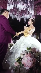 中國陶瓷大亨黃英明的獨子,去年在客戶的介紹下,認識的外型亮眼的「珠海女神」,兩人一見麵後迅速交往熱戀,不到幾個月後,就決定步入禮堂,攜手共度下半輩子,這場世紀婚禮也備受網友矚目,當天老公大手筆,為她掛上金手鐲、金項鍊,全身光芒耀眼,尤其手上的5克拉鑽戒,更是讓她走路都有風,羨煞不少人,沒想到新娘最後,突然表情嚴肅,說了一段話,讓富豪老公瞬間安靜了!