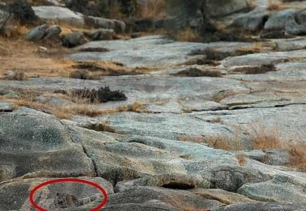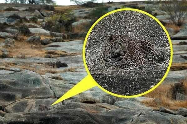但是在回到家後他翻看相片時卻嚇得半死,他隱約看到照片裡的角落不太對勁,像有什麼東西在盯著自己! 定睛一看後,嚇了一身冷汗。 原來在相片中有一隻花豹, 它運用石塊隱藏著自己,伺機而動。